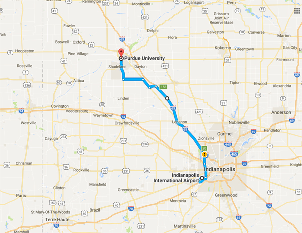 Purdue University is about 1.5 hours from the Indianapolis International Airport: